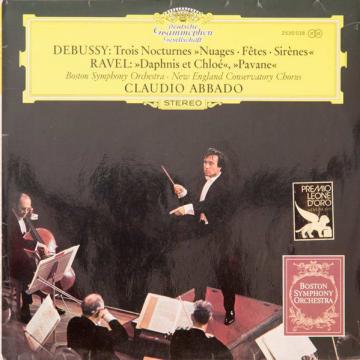 Vinylen, 'Nocturnes (Nuages · Fêtes · Sirènes) / Daphnis Et Chloé II · Pavane', af Claude Debussy, Maurice Ravel, Boston Symphony Orchestra, New England Conservatory Chorus, Claudio Abbado, udkom i år 1970.